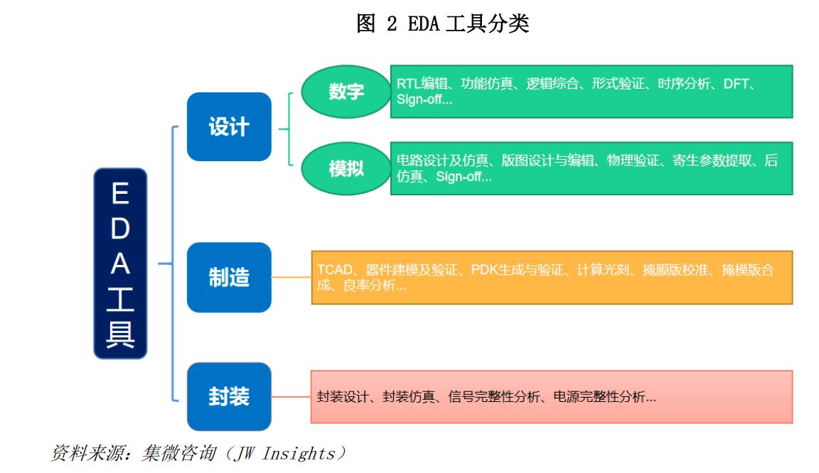 从工具分类来看,EDA行业呈现清晰的细分赛道布局。设计类EDA作为核心环节,进一步分为数字设计与模拟设计两大方向: