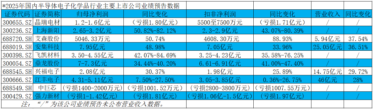 2025年,受益半导体行业景气度回升、国产替代进程加速,国内电子化学品上市公司整体经营业绩呈现快速增长态势,但企业间发展分化显著。从净利润增速业绩表现看,行业可清晰划分为四大梯队,梯队差距既源于下游需求承接能力,更取决于企业在高端产品技术攻坚、产品结构优化和成本管控等方面的核心实力。而根据十家公司已公布2025年业绩预告数据,通过对比分析其净利润增速、业绩变动原因,可剖判行业发展特征与企业竞争逻辑。