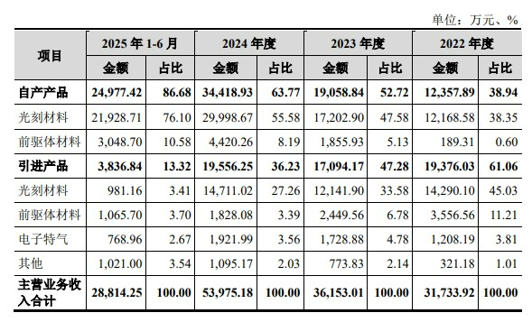 早在2015年,恒坤新材便开启集成电路关键材料的自主研发布局,逐步推进业务转型;2018年启动大连前驱体材料工厂、漳州光刻材料工厂建设;2020年起,光刻材料与前驱体材料陆续实现量产供货。截至2025年上半年,恒坤新材自产产品占主营业务收入的比例已超过85%,较2024年的63.77%大幅提升,自产产品已成为公司营收的核心支柱。