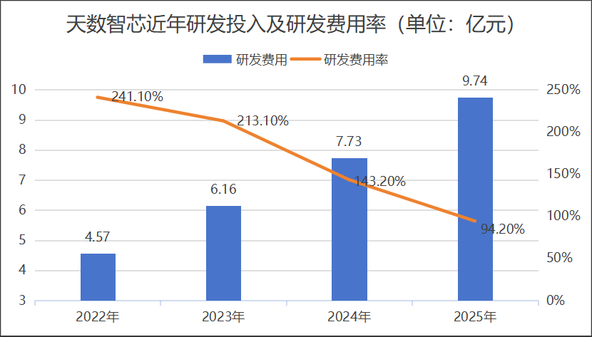 与此同时,天数智芯持续加大创新投入,2025年研发开支达9.74 亿元,同比增长26.1%,占总营收的比例为94.2%,仍处于高投入状态。研发投入增长主要用于扩充研发团队、增加研发设备及IP投入,以及推进多个研发项目,为产品迭代与技术创新提供坚实支撑。