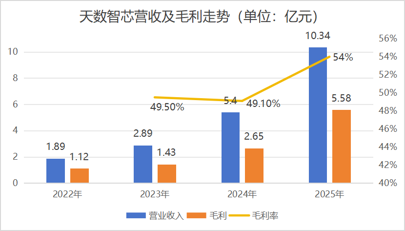 2025年,天数智芯整体经营呈现“高增长、优结构、减亏损”的核心特征。营收方面,全年实现收入10.34亿元,同比大幅增长91.6%,彰显核心产品市场需求的强劲韧性;毛利方面,全年毛利达5.58亿元,同比增长110.5%,毛利增速高于营收增速,体现公司产品技术附加值与定价能力的持续提升,全年整体毛利率由2024年的49.1%提升至54%,盈利能力稳步改善。