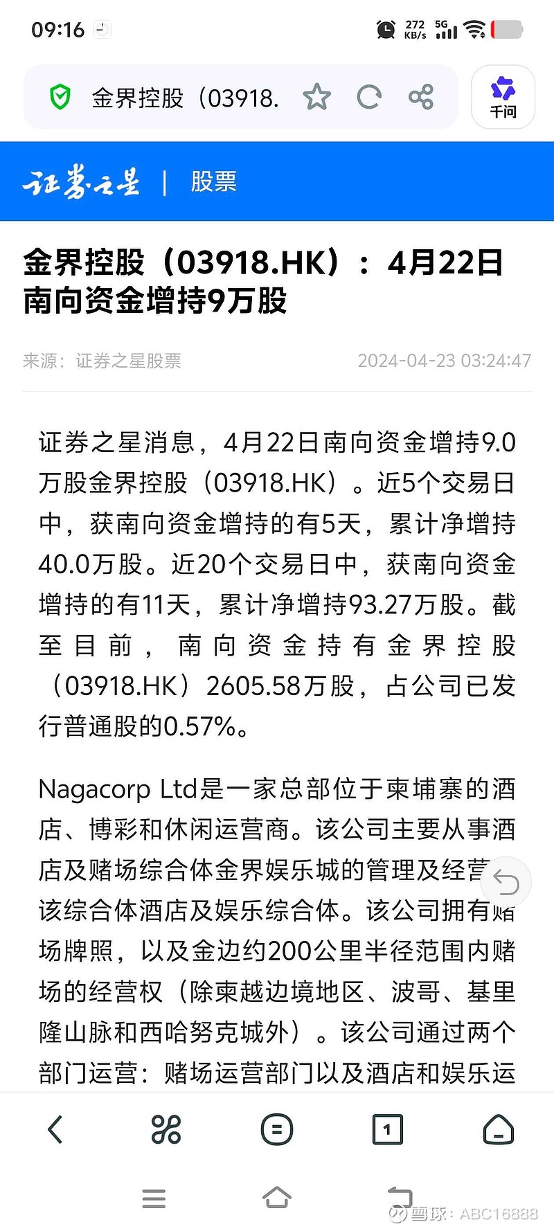 南向资金持股量0.57%