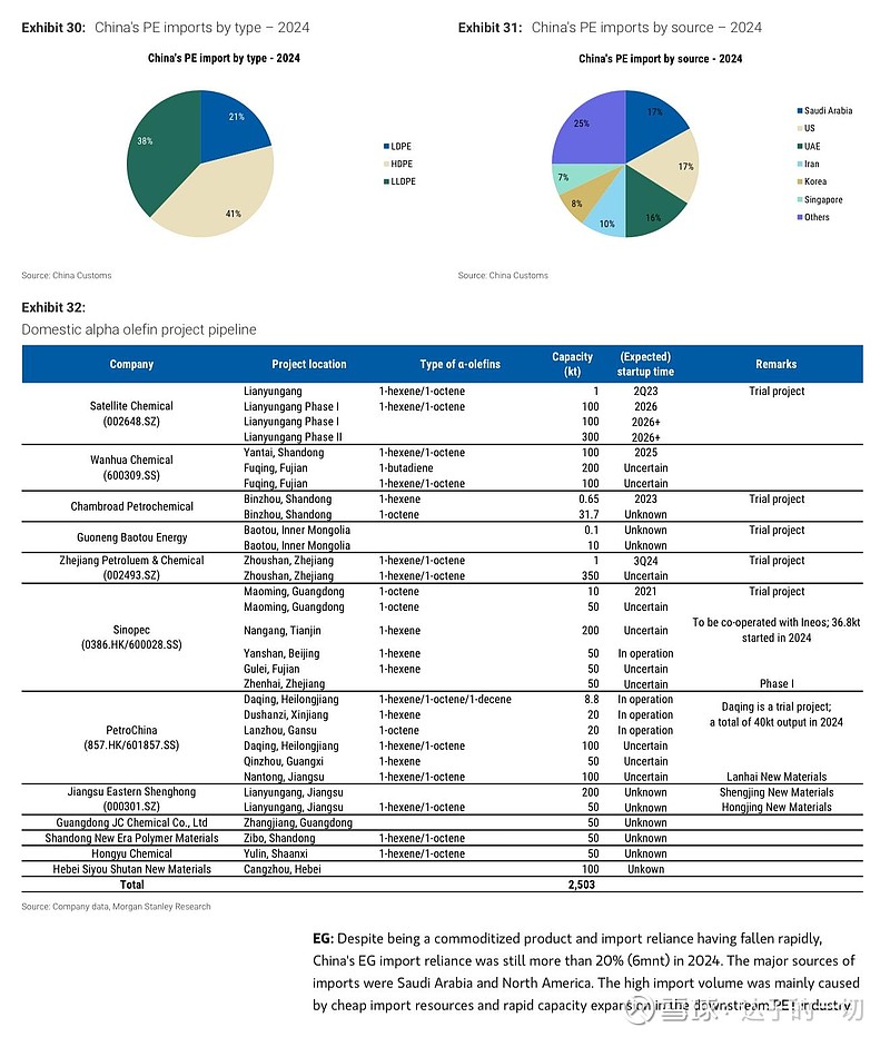 • 国产替代新动向:万华化学、卫星化学等企业加速布局α-烯烃(PE高端化关键原料),预计2026年后国内产能逐步释放,缓解高端PE进口依赖。