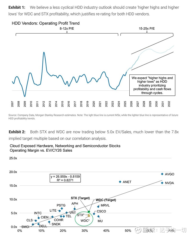 • 估值端:HDD行业正从“高周期大宗商品”向“AI数据存储寡头资产”转型,参考云硬件、半导体同业的估值回归(运营利润率与EV/销售额相关系数R²达0.8271),西部数据、希捷当前4-4.5倍EV/销售额估值,有望向8倍目标倍数靠拢。