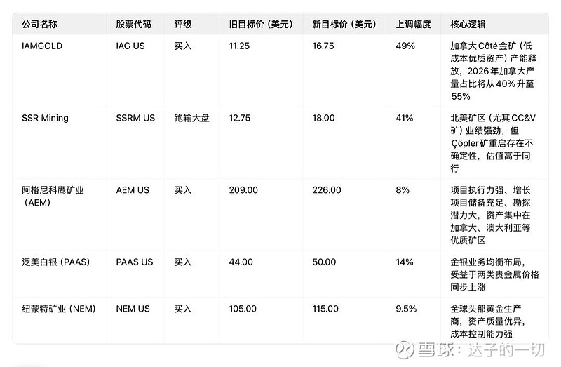 • 其他公司:多数维持原有估值倍数,仅因金价预测上调推动NAV与目标价被动提升。