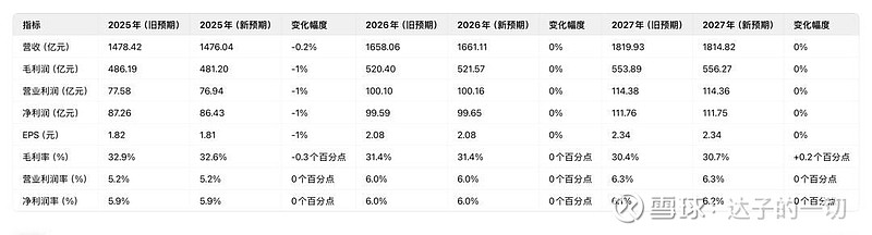 受2025年三季度业绩影响,我们将2025年每股收益(EPS)预期小幅下调1%,从1.82元调整至1.81元;2026-2027年EPS预期维持不变,分别为2.08元、2.34元。营收及利润端,2025年营收预期从1478.42亿元微调至1476.04亿元(-0.2%),净利润从87.26亿元调整至86.43亿元(-1%);2026-2027年营收、利润预期基本持平,毛利率、营业利润率等核心盈利指标保持稳定。