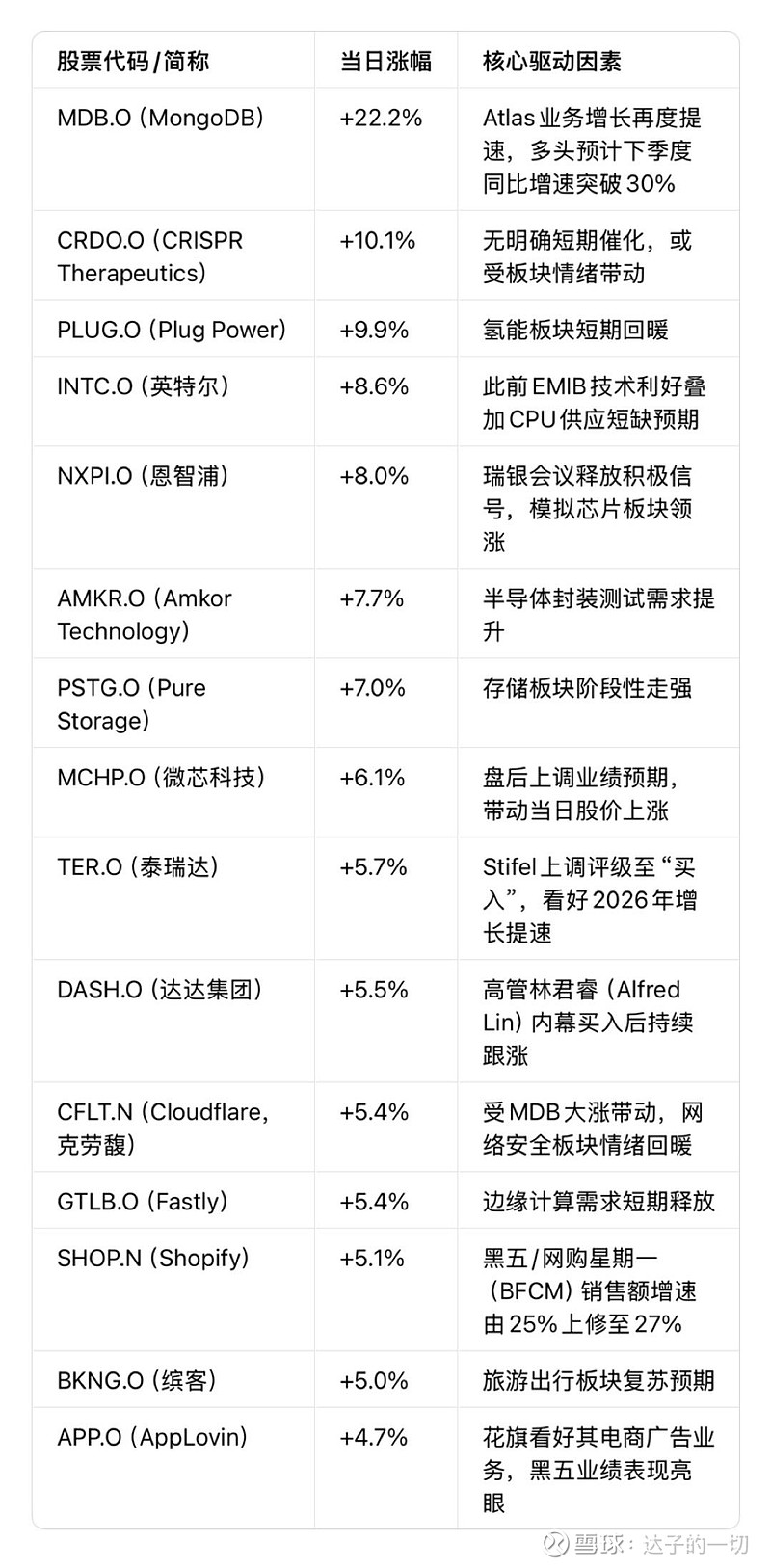 3. MongoDB(MDB.O):大涨22%。核心驱动为Atlas业务增长再度提速,多头预计下季度同比增速突破30%;但需注意,Atlas业务同比基数在过去3个季度偏低,后续基数将显著提高,增长压力或加大。受其带动,CFLT.N(Cloudflare,克劳馥)上涨5%、SNOW.N(Snowflake)上涨3%。