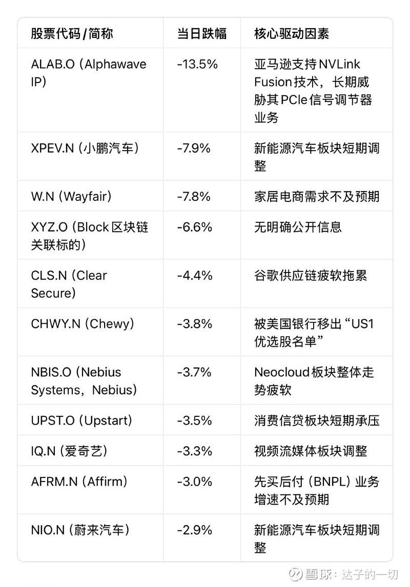 • Alphawave IP(ALAB.O):暴跌12%。亚马逊宣布支持NVLink Fusion技术,此前多头寄望Trainium芯片成为公司增长点; Barclays分析师指出,NVLink Fusion技术将构建兼容GPU和Trainium服务器的机架级AI基础设施,长期侵蚀ALAB高利润的PCle信号调节器业务,构成利空。