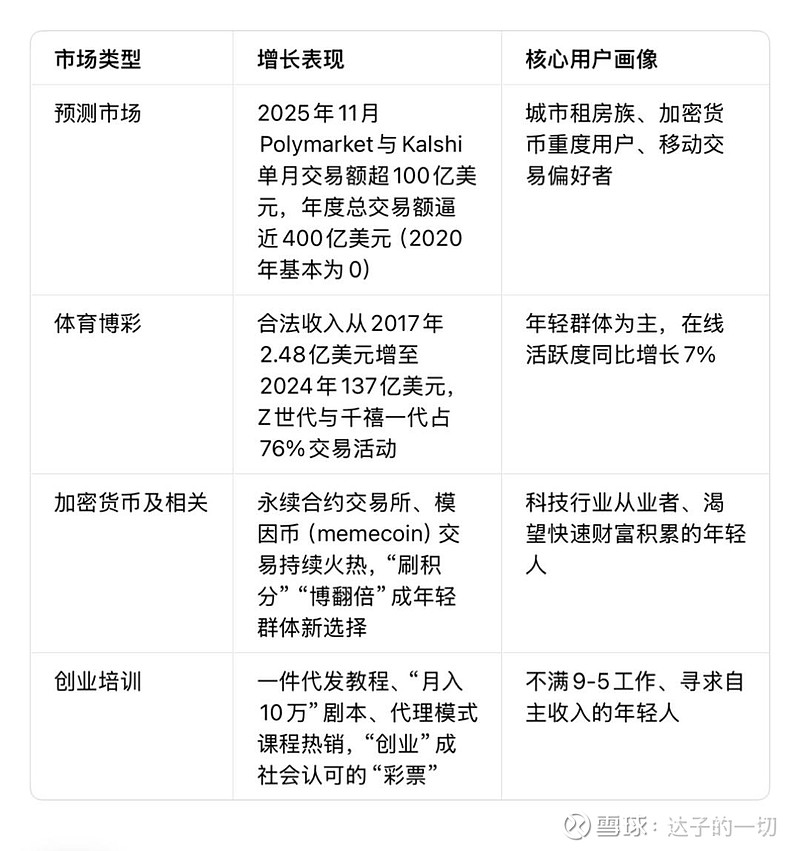 当40岁以上的人还在建议“精进业务、稳定加薪”时,年轻一代却在疯狂涌入加密货币、预测市场、体育博彩等高波动领域。这并非单纯的“好高骛远”,而是传统财富积累路径崩塌后,一代人的理性选择。本文基于系统性分析,拆解“长期堕落主义”背后的经济逻辑与投资机会。