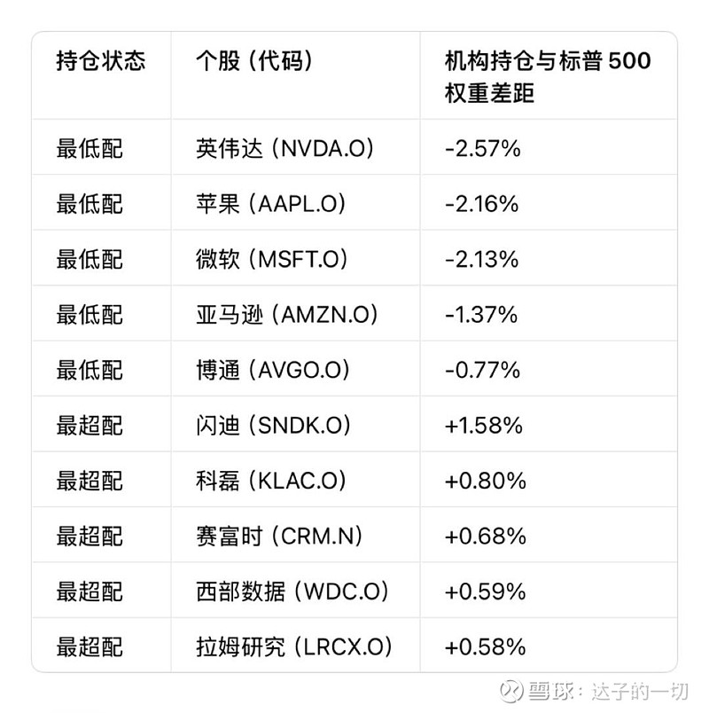 • 最Over-Owned(超配):图表下半部分的公司(如赛富时、科磊、闪迪、西部数据、希捷)被机构“买多了”,表现为机构权重(红色菱形)>指数权重(蓝色菱形)。机构的策略逻辑是:试图在二线科技股或半导体设备股中寻找超额收益(Alpha),来弥补在巨头身上丢失的指数收益(Beta)。
