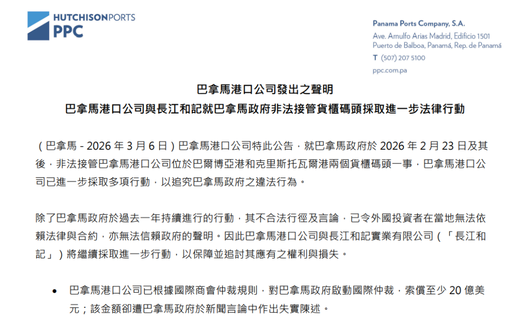 巴拿马港口公司相关声明声明称,巴拿马政府于2月23日及其后,非法接管巴拿马港口公司位于巴尔博亚港和克里斯托瓦尔港两个货柜码头⼀事,巴拿马港口公司已进⼀步采取多项行动,以追究巴拿马政府的违法行为。