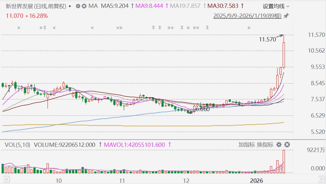 格隆汇1月19日|新世界发展(0017.HK)股价今日急升,盘中一度涨超21%报11.57港元,为连续第9日上涨,股价创2024年1月以来新高,最终收涨16.28%报11.07港元。彭博引述分析师指出,市场猜测该公司可能进行资产交易。