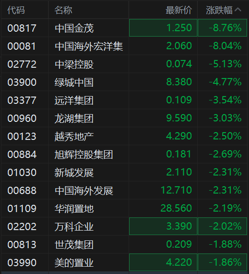 格隆汇12月9日|港股内房股跌幅进一步扩大,其中,中国金茂跌近9%,中国海外宏洋集团跌8%,中梁控股跌超5%,绿城中国跌4.77%,远洋集团、龙湖集团跌超3%,越秀地产、旭辉控股集团、新城发展、中国海外发展、华润置地均跌超2%。
