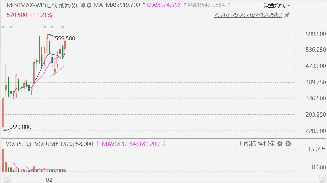 MiniMax-WP(0100.HK)盘中大涨13%,报580港元,市值超1800亿港元。消息面上,据悉M2.5模型即将正式上线,目前MiniMax M2.5模型已在海外的MiniMax Agent产品进行内测。