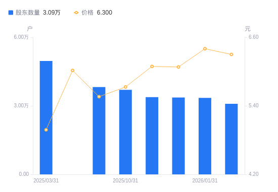 近一年(2024年12月31日至2025年12月31日),四川成渝A股股东户数从5.37万户,减低至3.36万户,降幅37.36%,区间股价上涨24.08%。