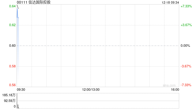 信达国际控股(00111)早盘高开逾5%,截至发稿,股价上涨5%,现报0.63港元,成交额149.83万港元。