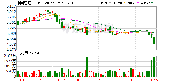 财报发布后的第一个交易日(11月25日),中国旺旺盘中最高跌超6.5%,最后以4.71港元/股收盘,下跌4.27%。与此同时,公司核心业务增长疲软、费用高企等问题引发市场关注。