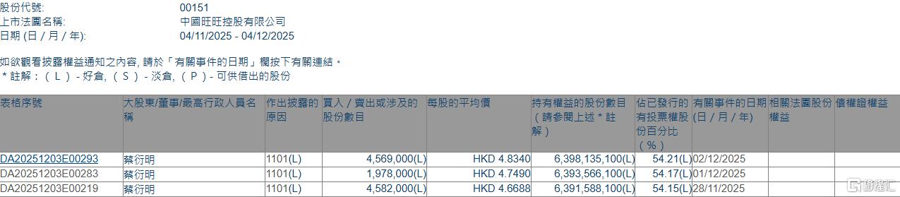 格隆汇12月4日丨根据联交所最新权益披露资料显示,2025年11月28日-12月2日,中国旺旺(00151.HK)获执行董事蔡衍明在场内以每股均价4.6688-4.834港元合计增持1112.9万股,涉资约5287.3万港元。