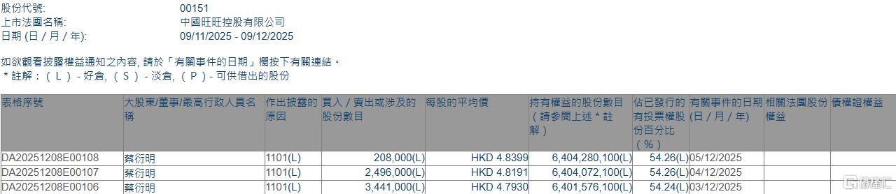 格隆汇12月9日丨根据联交所最新权益披露资料显示,2025年12月3日-12月5日,中国旺旺(00151.HK)获执行董事蔡衍明在场内以每股均价4.793-4.8399港元合计增持614.5万股,涉资约2952.8万港元。