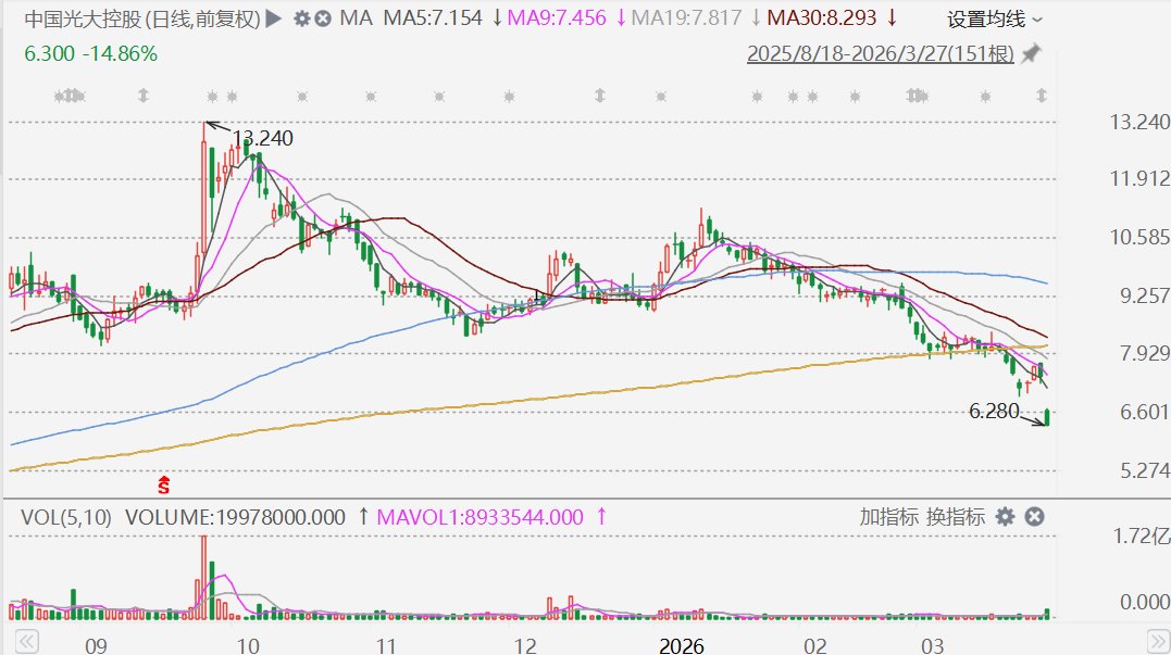 格隆汇3月27日|中国光大控股(0165.HK)盘中一度大跌超15%至6.28港元,股价创2025年6月以来新低。公司公布业绩显示,2025年营业额82.86亿港元,同比升26.54%;股东应占亏损扩大至20.08亿港元,上年同期蚀19.09亿元。