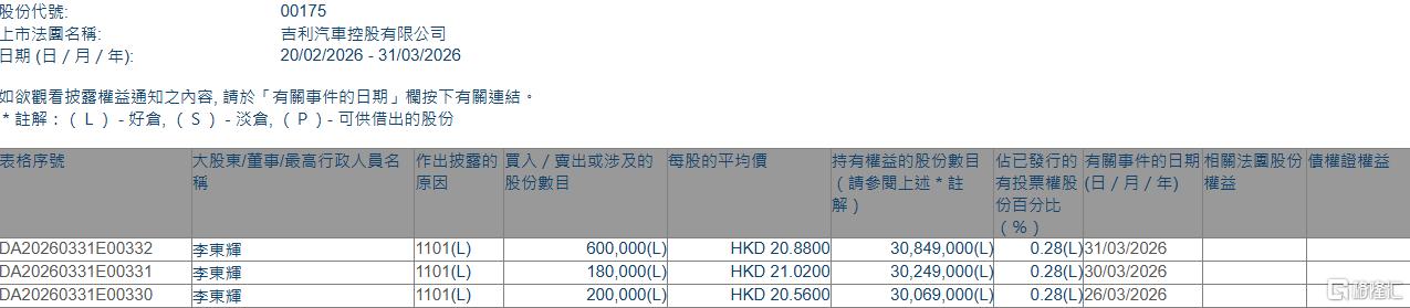 格隆汇3月31日丨根据联交所最新权益披露资料显示,2026年3月26日-3月31日,吉利汽车(00175.HK)获执行董事李东辉在场内以每股均价20.56-21.02港元合计增持98万股,涉资约2042.4万港元。