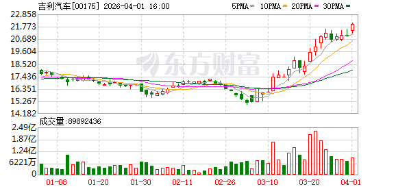 4月1日,吉利汽车(00175/80175)发布公告,本集团于2026年3月的汽车总销量为23万部,与去年同期持平;今年累计销量71万部,较去年同期增加1%。