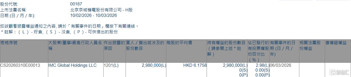 格隆汇3月10日丨根据联交所最新权益披露资料显示,2026年3月6日,京城机电股份(00187.HK)遭IMC Global Holdings LLC在场内以每股均价6.1758港元减持298万股,涉资约1840.4万港元。