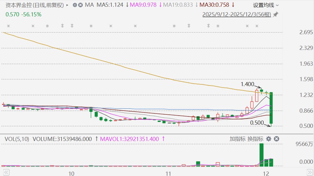 格隆汇12月3日|港股市场资本界金控(0204.HK)盘中暴跌超60%至0.5港元,创历史新低,市值跌至1亿港元。该股近期股价异常波动,此前连升5日,一度从0.72港元升至1.4港元,期间股价逼近翻倍,随后回落,直指今日跌势急剧扩大。