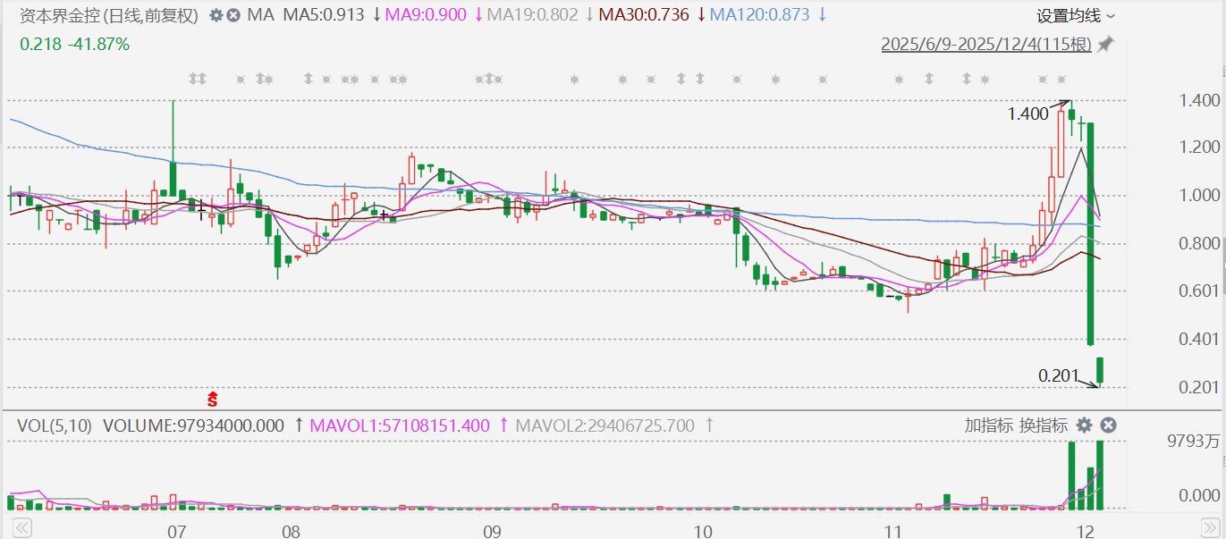 格隆汇12月4日|港股市场资本界金控(0204.HK)在昨日收跌超70%后,今日仍未止跌,盘中再度暴跌超40%至0.201港元,再创历史新低。