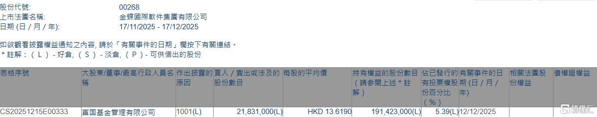 格隆汇12月17日丨根据联交所最新权益披露资料显示,2025年12月12日,金蝶国际(00268.HK)获富国基金管理有限公司在场内以每股均价13.619港元增持2183.1万股,涉资约2.97亿港元。