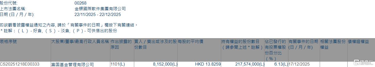 格隆汇12月22日丨根据联交所最新权益披露资料显示,2025年12月17日,金蝶国际(00268.HK)获富国基金管理有限公司在场内以每股均价13.8259港元增持815.2万股,涉资约1.13亿港元。