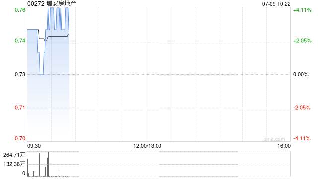 瑞安房地产(00272)早盘一度涨超4%,截至发稿,股价上涨2.74%,现报0.75港元,成交额1168.80万港元。