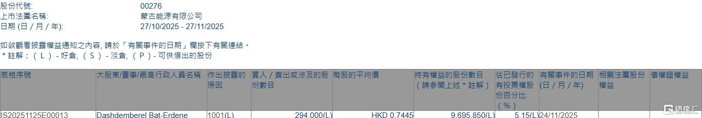 格隆汇11月27日丨根据联交所最新权益披露资料显示,2025年11月24日,蒙古能源(00276.HK)获Dashdemberel Bat-Erdene在场内以每股均价0.7445港元增持29.4万股,涉资约21.9万港元。