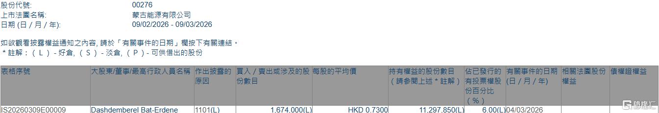 格隆汇3月9日丨根据联交所最新权益披露资料显示,2026年3月4日,蒙古能源(00276.HK)获Dashdemberel Bat-Erdene在场内以每股均价0.73港元增持167.4万股,涉资约122.2万港元。
