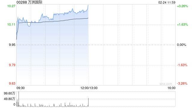 万洲国际(00288)盘中涨近3%,截至发稿,股价上涨2.71%,现报10.22港元,成交额8217.73万港元。