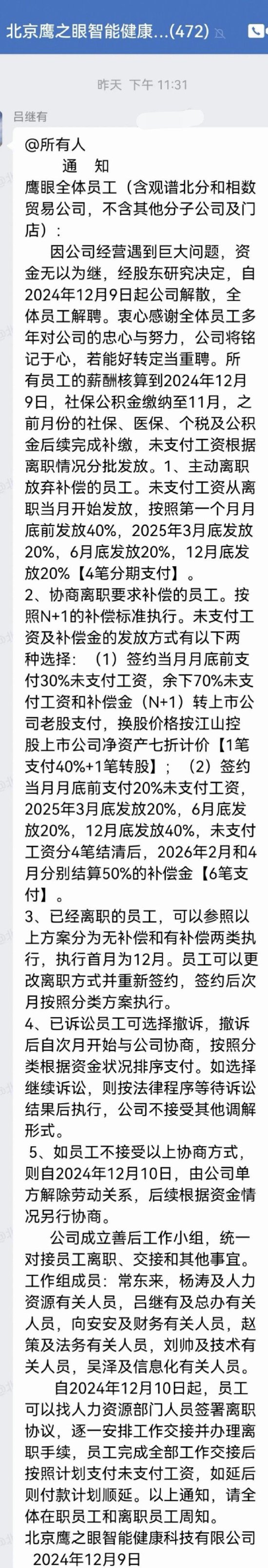 多位鹰眼智慧中医员工向新浪科技表示,在12月9日半夜23:31分,公司战略管理部总经理兼总裁办公室主任吕继有突然在企业微信全员群里发布了解散通知。通知称,因公司经营遇到巨大问题,资金无以为继,经股东研究决定,自2024年12月9日起公司解散,全体员工解聘。所有员工的薪酬核算到2024年12月9日,社保公积金缴纳至11月,之前月份的社保、医保、个税及公积金后续完成补缴,未支付工资根据离职情况分批发放。