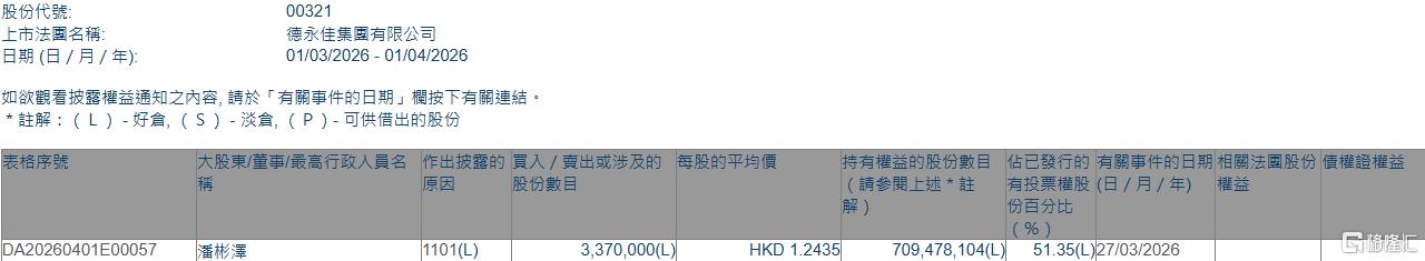 格隆汇4月1日丨根据联交所最新权益披露资料显示,2026年3月27日,德永佳集团(00321.HK)获执行董事潘彬泽在场内以每股均价1.2435港元增持337万股,涉资约419.06万港元。