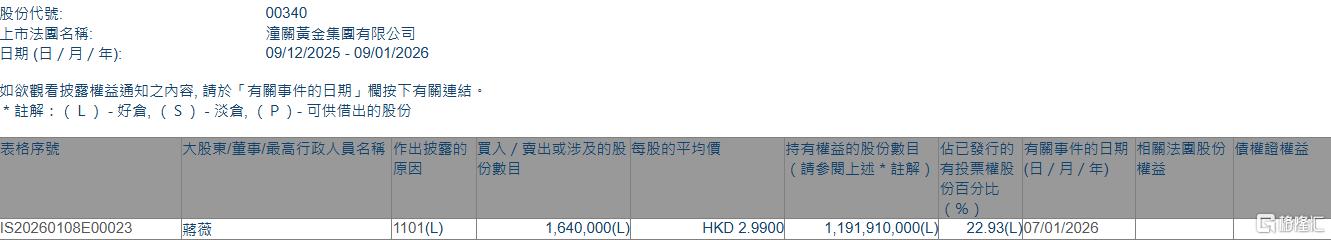 格隆汇1月9日丨根据联交所最新权益披露资料显示,2025年1月7日,潼关黄金(00340.HK)获股东蒋薇在场内以每股均价2.99港元增持164万股,涉资约490.36万港元。