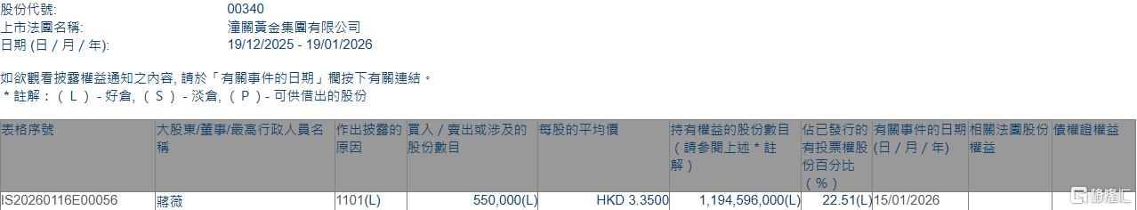 格隆汇1月19日丨根据联交所最新权益披露资料显示,2025年1月15日,潼关黄金(00340.HK)获股东蒋薇在场内以每股均价3.35港元增持55万股,涉资约184.25万港元。