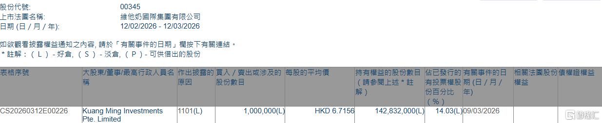 格隆汇3月12日丨根据联交所最新权益披露资料显示,2026年3月9日,VITASOY INT'L(00345.HK)获Kuang Ming Investments Pte. Limited在场内以每股均价6.7156港元增持100万股,涉资约671.56万港元。