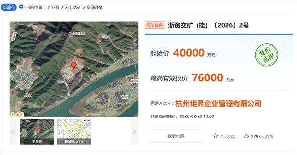 浙江省杭州市富阳区新桐乡江洲村建筑用砂岩矿矿区面积约0.4959平方千米,矿区范围内共计出让资源量3980万吨(1479.2万方),其中建筑用砂岩矿2456.6万吨(916.6万方),宕碴1523.4万吨(562.6万方),设计建设规模980万吨/年,采矿权期限5年(含基建期6个月),挂牌出让采用有底价增价方式报价,初次报价不得低于4亿元,每次报价应当比当前最高有效报价递增100万元或100万元的整数倍。