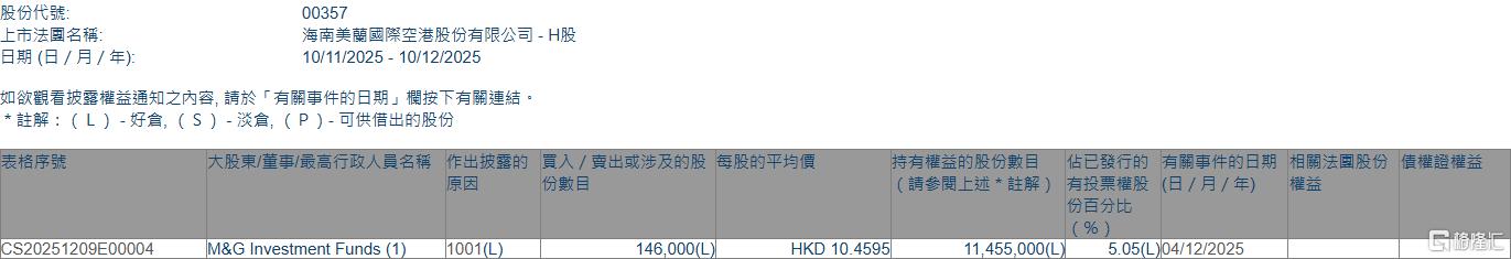 格隆汇12月10日丨根据联交所最新权益披露资料显示,2025年12月4日,美兰空港(00357.HK)获M&G Investment Funds (1)在场内以每股均价10.4595港元增持14.6万股,涉资约152.71万港元。