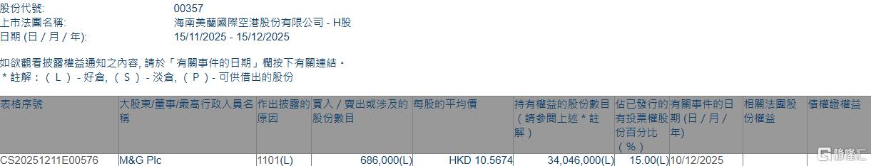 格隆汇12月15日丨根据联交所最新权益披露资料显示,2025年12月10日,美兰空港(00357.HK)获M&G Plc在场内以每股均价10.5674港元增持68.6万股,涉资约724.92万港元。