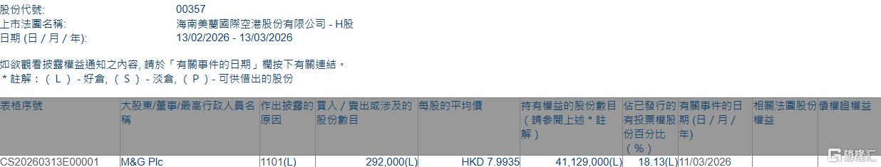 格隆汇3月13日丨根据联交所最新权益披露资料显示,2026年3月11日,美兰空港(00357.HK)获M&G Plc在场内以每股均价7.9935港元增持29.2万股,涉资约233.41万港元。