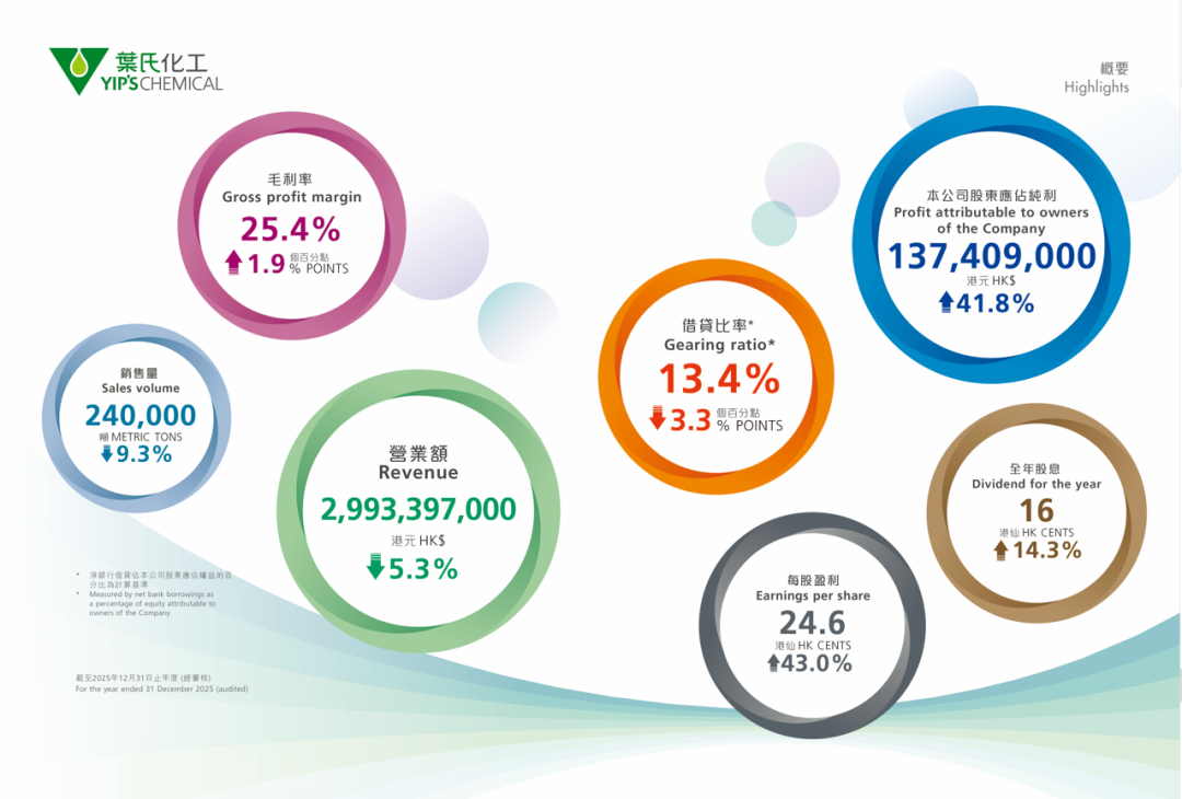 2025年,行业整体面临多重挑战,市场竞争加剧、需求端承压,叶氏化工整体经营也受到一定影响。全年集团实现营业额29.9亿港元,销量达24万吨,同比分别回落5.3%、9.3%,在行业下行周期中,整体经营保持平稳,未出现大幅波动。