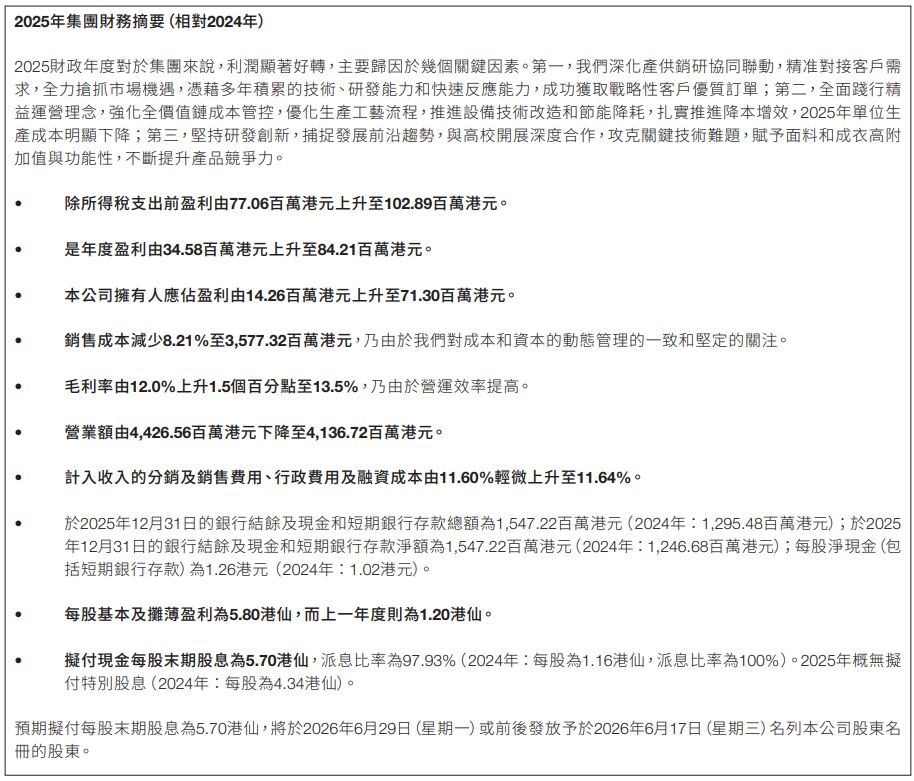 在财务报表附注中,公司的银行结余及现金和短期银行存款总额为15.47亿港元,较2024年增加。公司的流动比率为3.7,净资产为34.82亿港元,整体财务状况保持稳健。业务分部方面,核心业务的色布及纱的生产与销售占据了营业额的86.8%,而成衣的销售则占据13.2%。整体来看,公司的业绩