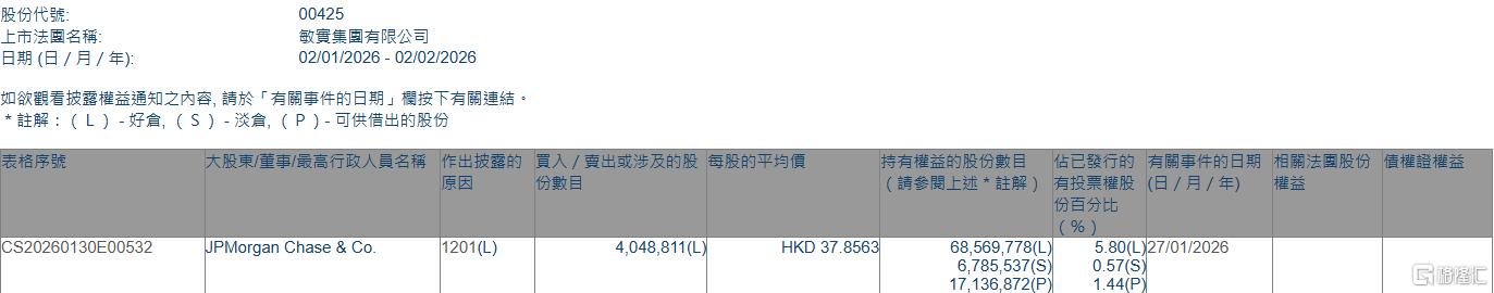 格隆汇2月2日丨根据联交所最新权益披露资料显示,2026年1月27日,敏实集团(00425.HK)遭JPMorgan Chase & Co.以每股均价37.8563港元减持好仓404.88万股,涉资约1.53亿港元。
