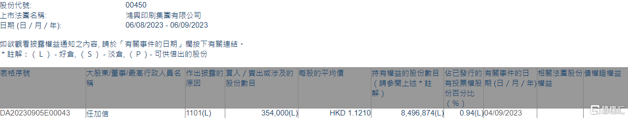 格隆汇9月6日丨根据联交所最新权益披露资料显示,2023年9月4日,鸿兴印刷集团(00450.HK)获执行董事任加信在场内以每股均价1.121港元增持35.4万股,涉资约39.68万港元。