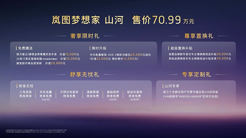 【2025年11月21日 广州】11月21日,“新时代旗舰四座MPV”岚图梦想家 山河正式上市,新车售价70.99万元,用户下订可享山河专属四重礼。岚图梦想家山河不仅是唯一搭载华为乾崑智驾ADS4和鸿蒙座舱5的四座MPV,拥有最顶尖的主动安全能力,也是全球首搭800V智能超混的四座MPV,融合62.5度大容量电池的从容续航,与5C超充技术的补能效率,轻松覆盖商务精英日行千里的全场景出行。