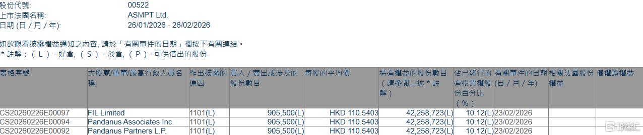 格隆汇2月26日丨根据联交所最新权益披露资料显示,2026年2月23日,ASMPT(00522.HK)获FIL Limited在场内以每股均价110.5403港元增持90.55万股,涉资约1亿港元。